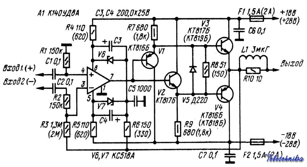 Каскад усиления напряжения сигнала выполнен на ОУ А1. Как видно из схемы, в цепь его питания подается часть выходного сигнала через цепь R6C3C4R4R5 (вместе со стабилитронами V6, V7 элементы этой цепи, кроме резистора R6, обеспечивают стабилизацию и фильтрацию питающих напряжений). В результате напряжения на выводах питания ОУ при максимальном сигнале смещаются (относительно общего провода) в соответствующую сторону и размах выходного сигнала ОУ значительно увеличивается. Возникающие при этом на входах ОУ большие синфазные сигналы не представляют собой опасности, так как ОУ их хорошо подавляет (типичное значение коэффициента ослабления 70…90 дБ). При подаче сигнала на инвертирующий вход стабилизированные напряжения питания не должны превышать +-28 В, на инвертирующих - значения, равного (11вх+28 В), где 11вх -амплитуда входного сигнала. Неиспользуемый вход в любом случае необходимо соединить с общим проводом. ОУ К140УД8А в усилители мощности можно заменить на К140УД8Б, К140УД6, К140УД10, К140УД11, К544УД1. Худшие результаты дает применение ОУ К140УД7. Вовсе не рекомендуется использовать ОУ К140УД1Б, К140УД2А, К140УД2Б, К153УД1. Вместо стабилитронов КС518А можно применить соединенные последовательно стабилитроны Д814А, Д814Б с общим напряжением стабилизации около 18В.