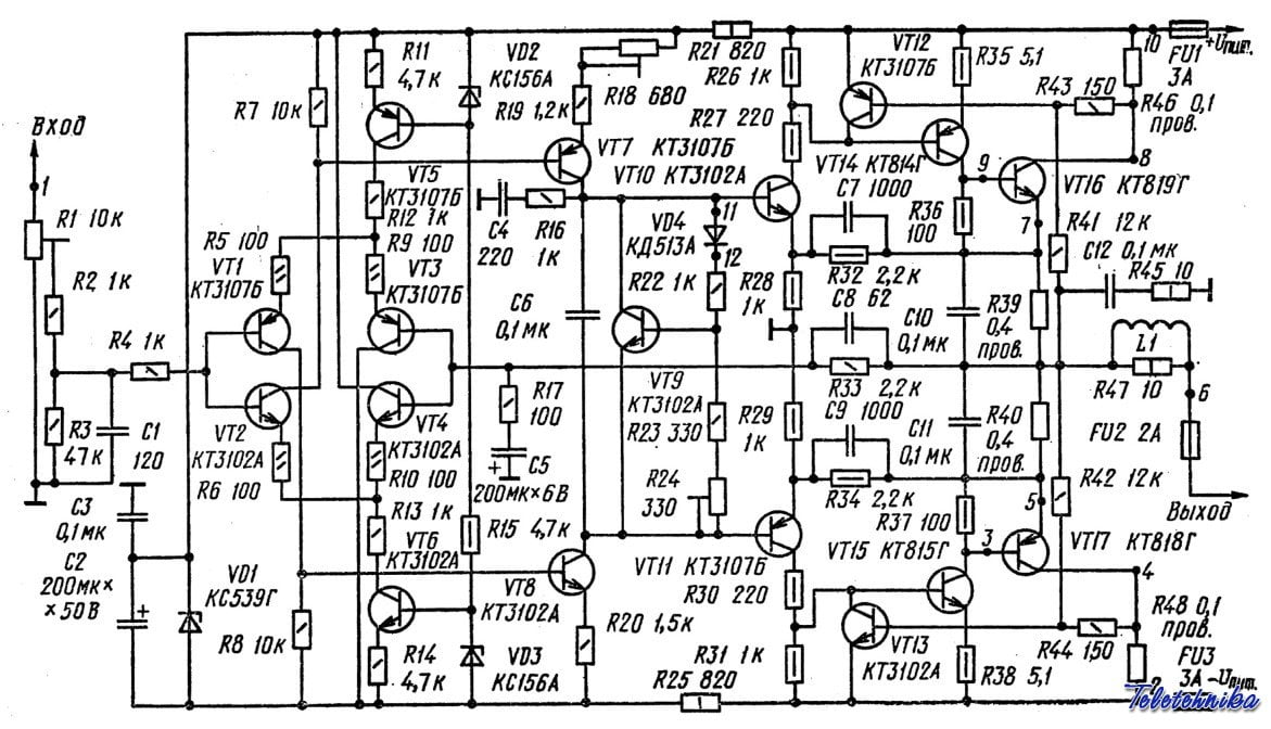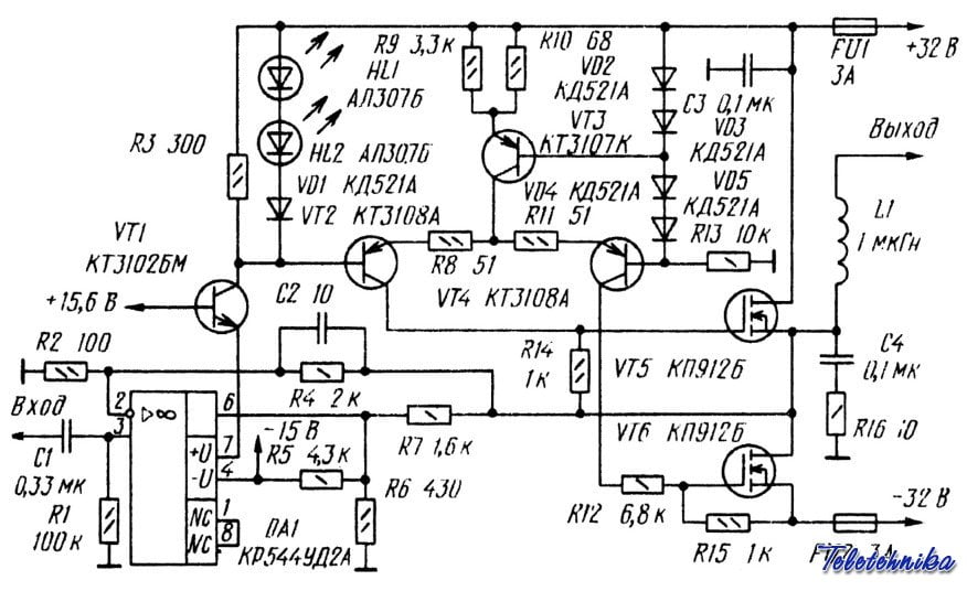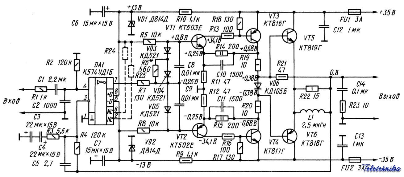 Вместо указанных на схеме можно использовать ОУ К574УД1А, К574УД1В и транзисторы тех же типов, что и на схеме, но с индексами Г, Д (VT1, VT2) и В (VT3 - VT6).