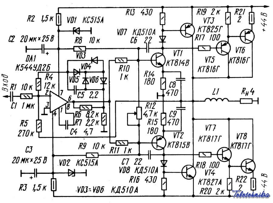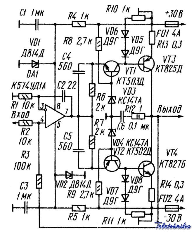 Вместо указанных на схеме в усилителе можно использовать ОУ К574УД1Б, К574УД1В, К544УД2, а также ( при некотором ухудшении параметров) К544УД1 и К140УД8А - К140УД8В; транзисторы КТ312В, KT373A(VT2), KT3107B, КТ3107И, КТ313Б, КТ361В, КТ361К (VT1, VT3, VT4), КТ315В (VT6, VT8), КТ801А, КТ801Б (VT7). Каждый из транзисторов КТ825Г можно заменить составными транзисторами КТ814В, КТ814Г+КТ818В, КТ818Г, а КТ827А -составными транзисторами КТ815В, КТ815Г+КТ819В, КТ819Г. Диоды VD3 - VD6, VD11, VD12 - любые кремниевые с максимальным прямым током не менее 100 мА, VD7 - VD10 - то же, но с максимальным током не менее 50 мА. При отсутствии стабилитронов КС515А допустимо использовать соединенные последовательно стабилитроны Д814А, Д814Б или КС175А.