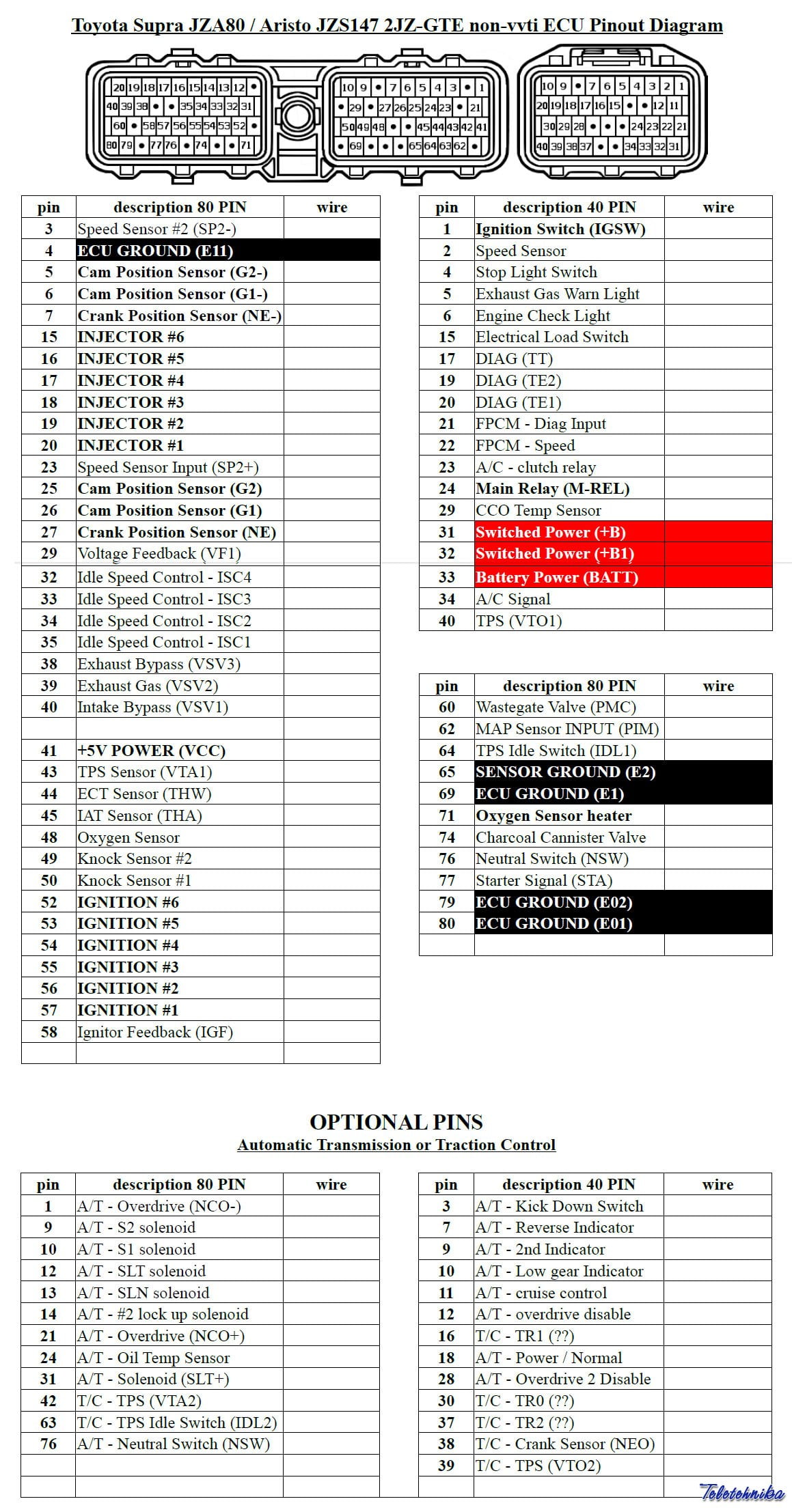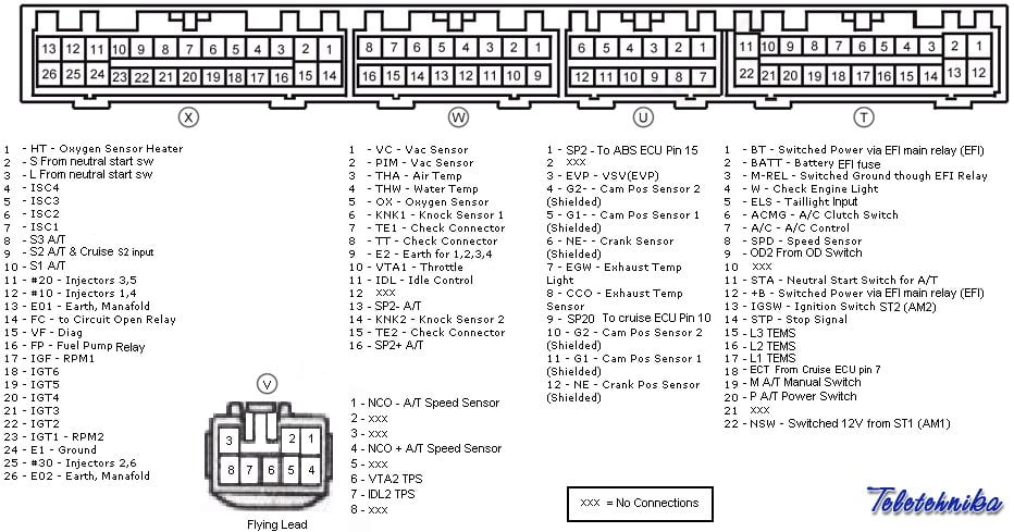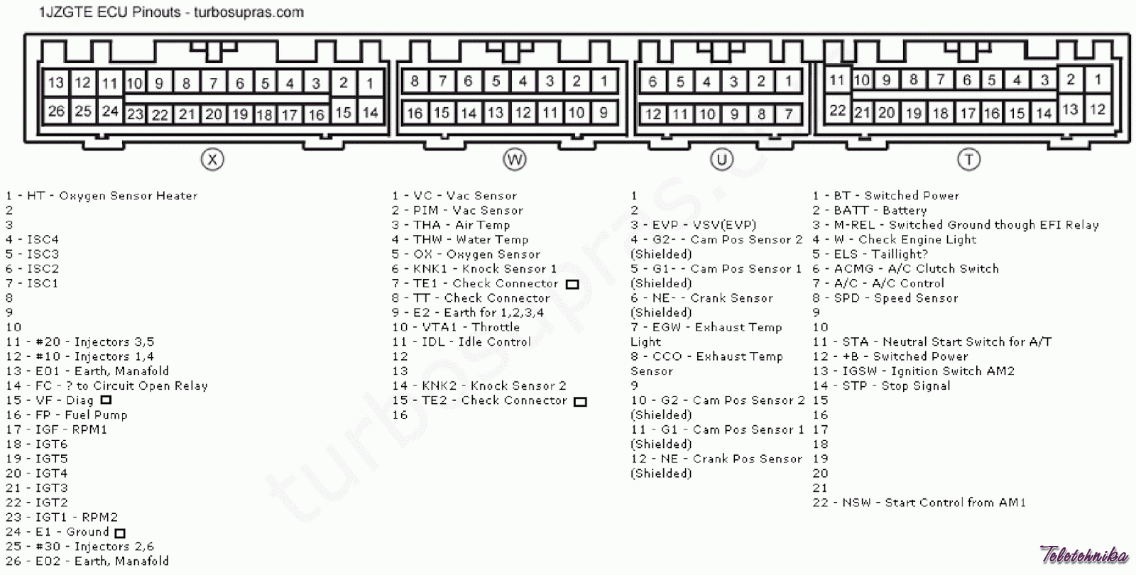 Toyota Supra JZA80 / Aristo JZS147 2JZ-GTE non-vvti ECU Pinout Diagram