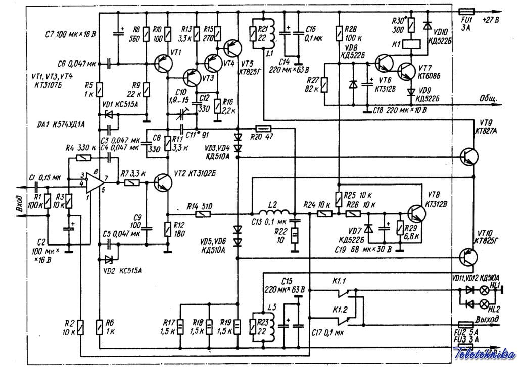 Вместо указанных на схеме в усилителе можно использовать ОУ К574УД1Б, К574УД1В, К544УД2, а также ( при некотором ухудшении параметров) К544УД1 и К140УД8А - К140УД8В; транзисторы КТ312В, KT373A(VT2), KT3107B, КТ3107И, КТ313Б, КТ361В, КТ361К (VT1, VT3, VT4), КТ315В (VT6, VT8), КТ801А, КТ801Б (VT7). Каждый из транзисторов КТ825Г можно заменить составными транзисторами КТ814В, КТ814Г+КТ818В, КТ818Г, а КТ827А -составными транзисторами КТ815В, КТ815Г+КТ819В, КТ819Г. Диоды VD3 - VD6, VD11, VD12 - любые кремниевые с максимальным прямым током не менее 100 мА, VD7 - VD10 - то же, но с максимальным током не менее 50 мА. При отсутствии стабилитронов КС515А допустимо использовать соединенные последовательно стабилитроны Д814А, Д814Б или КС175А.