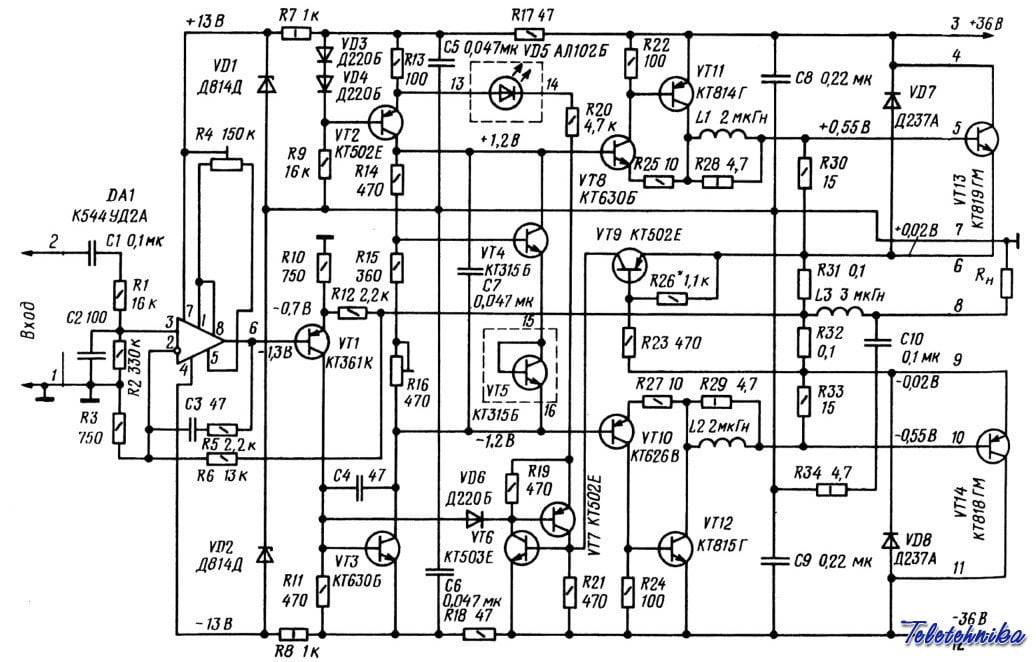 Резистором R14 устанавливается симметрия плеч выходного каскада усилителя.