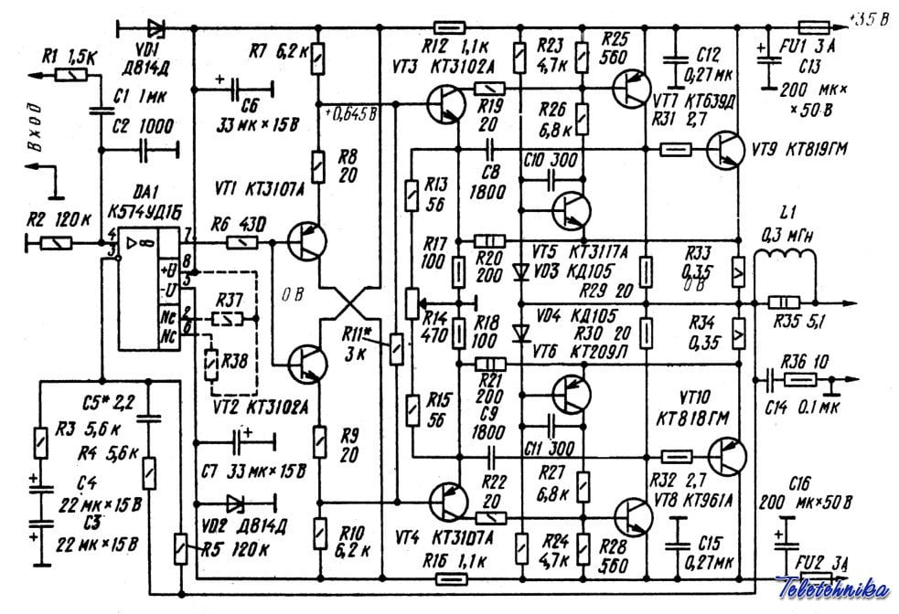 Вместо указанных на схеме можно использовать ОУ К574УД1А, К574УД1В и транзисторы тех же типов, что и на схеме, но с индексами Г, Д (VT1, VT2) и В (VT3 - VT6).